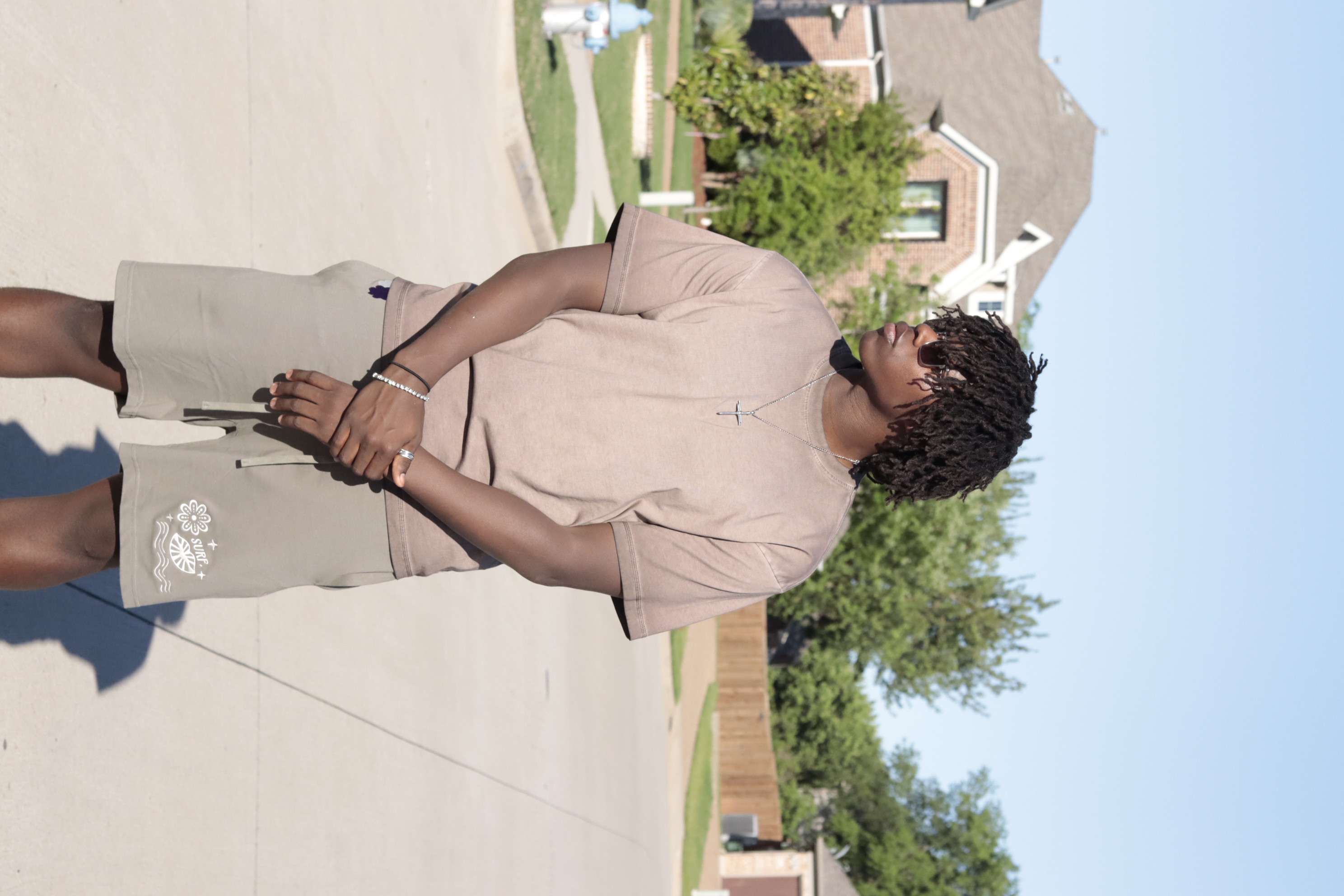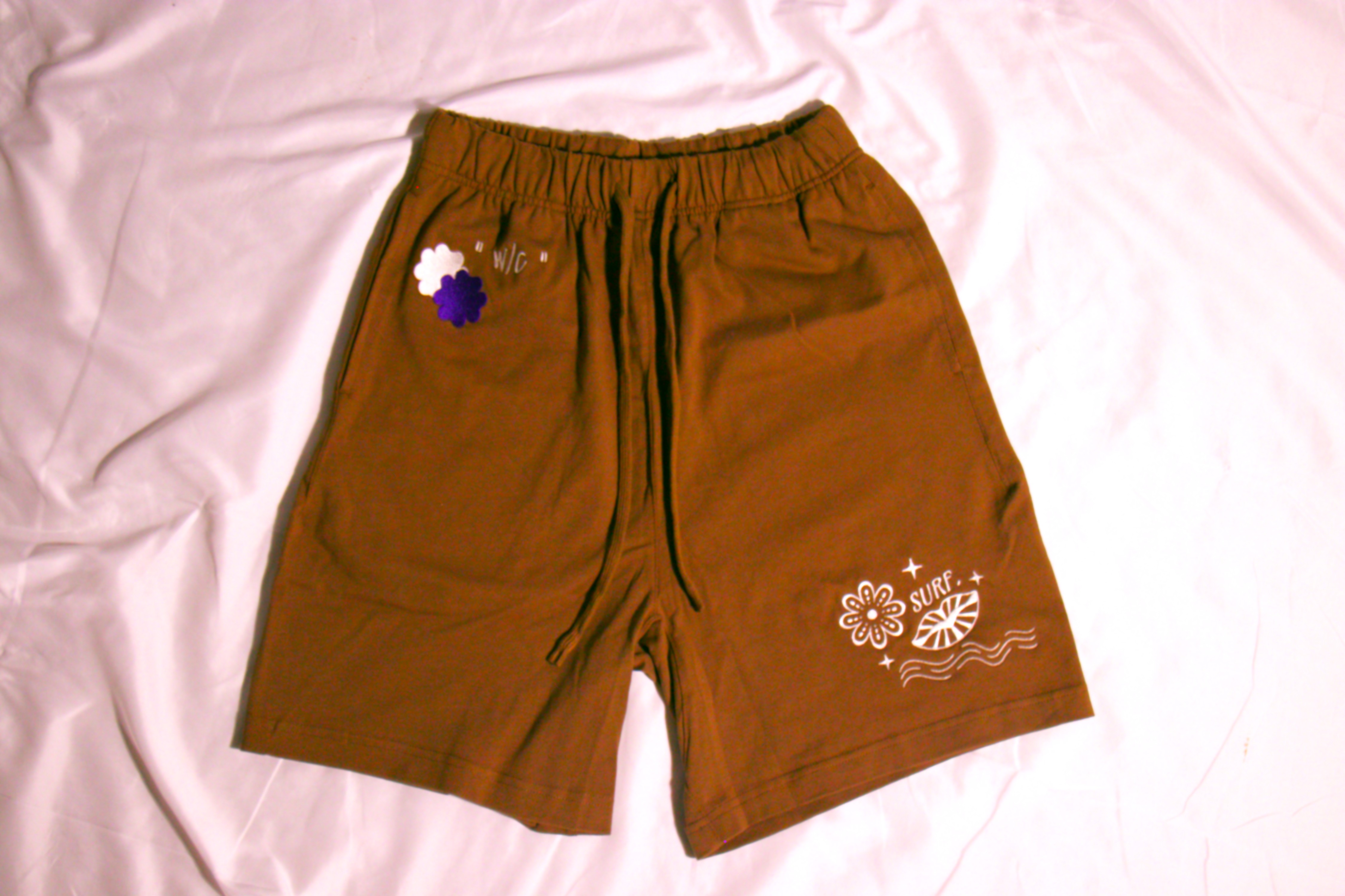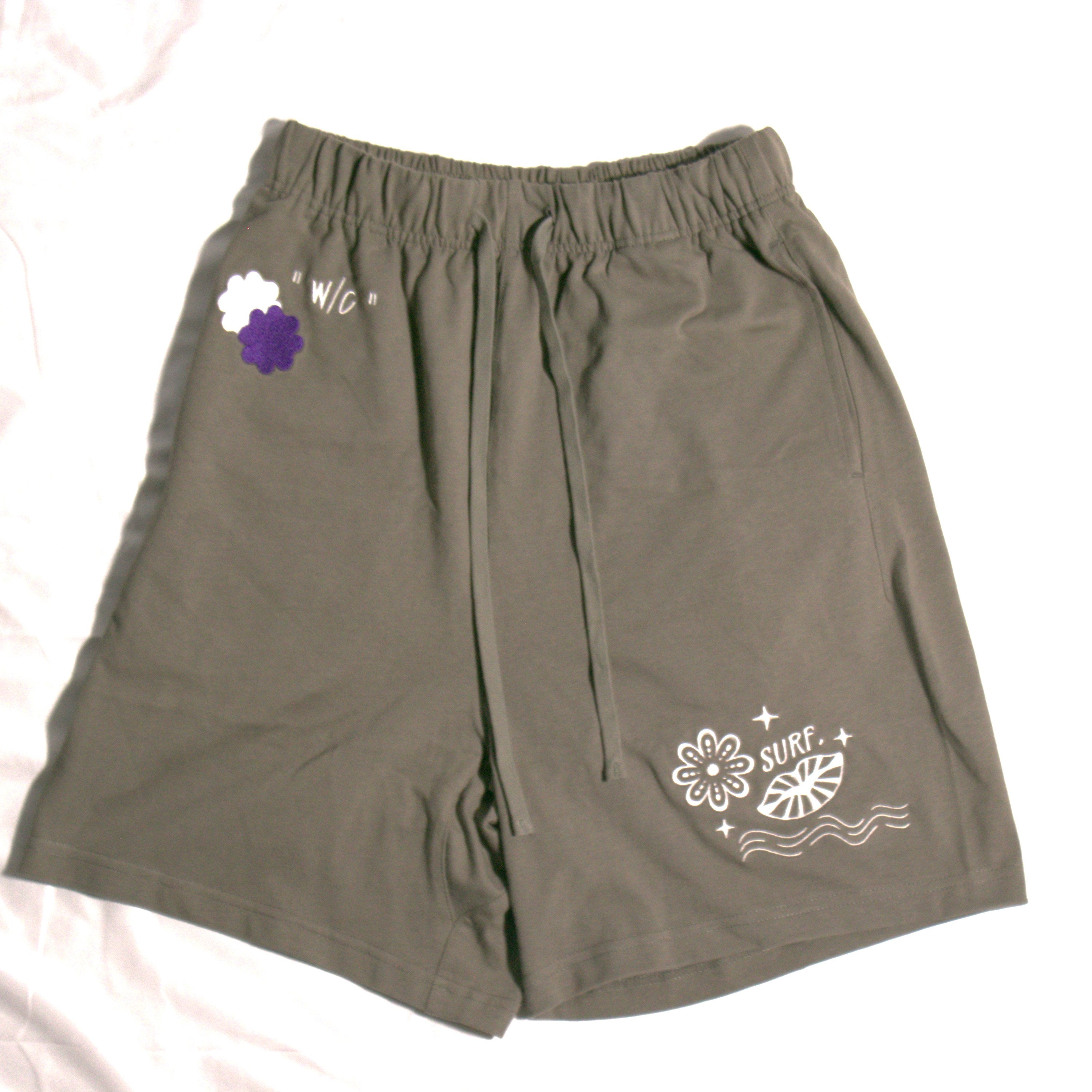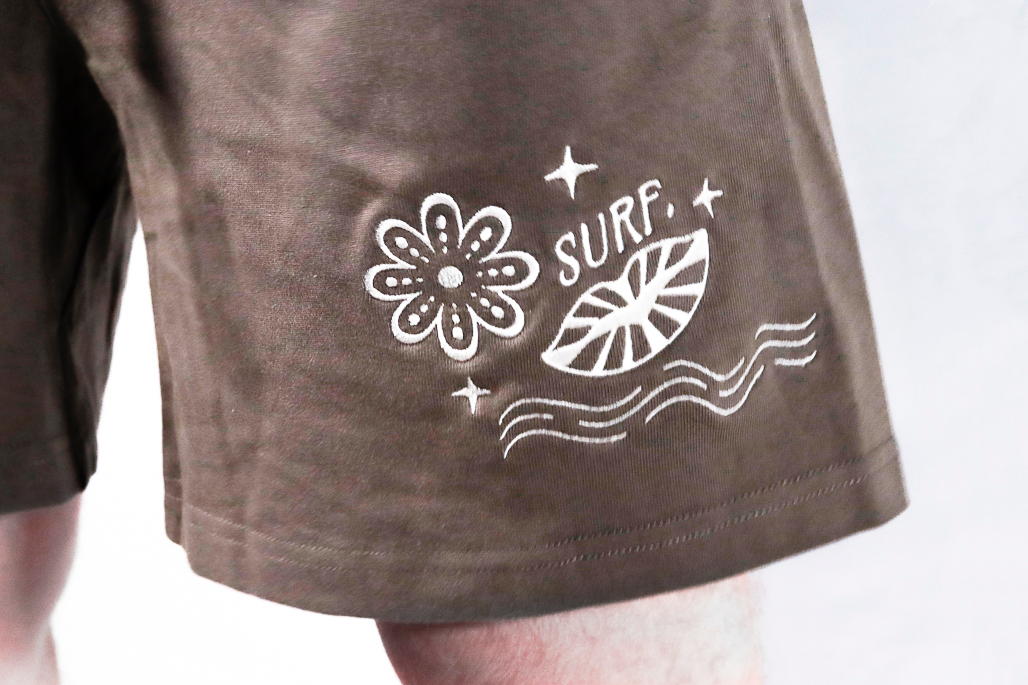 100% organic cotton shorts featuring sharp minimal embroidery. A subtle floral detail balances the 'surf' graphic on the lower leg, offering a clean, ocean-inspired aesthetic that transitions easily from the beach to the city.